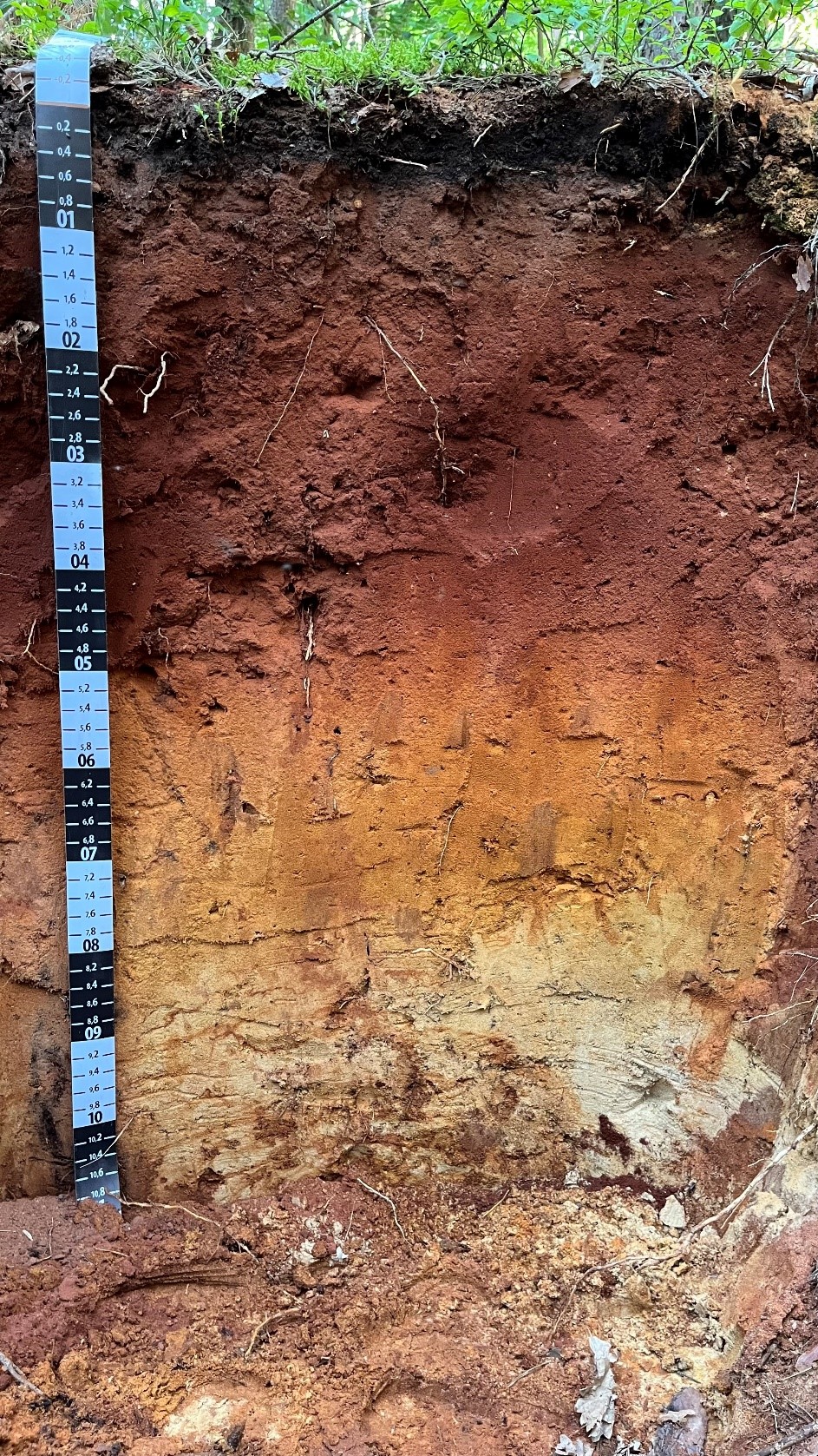 Abb. 1: Eine unter subtropische Bedingung im Tertiär entstandener Rheosol (nach KA6) in Brandenburg (auch Fuchserde genannt): Die Rotfärbung ist auf Hämatit zurückzuführen. Nach WRB ist es ein Arenosol (Bild von Tino Degenhardt).